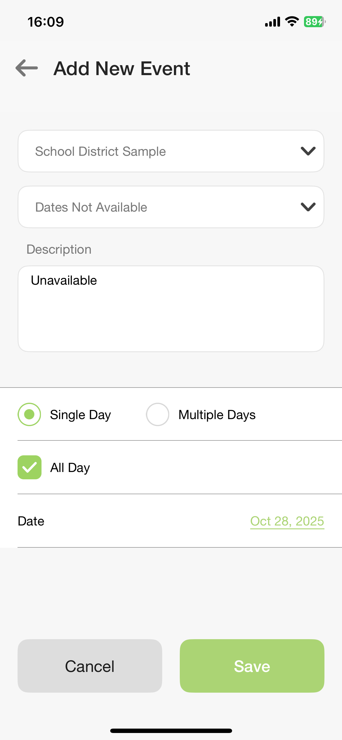 - If you are unavailable all day, place a checkmark next to “All Day”.