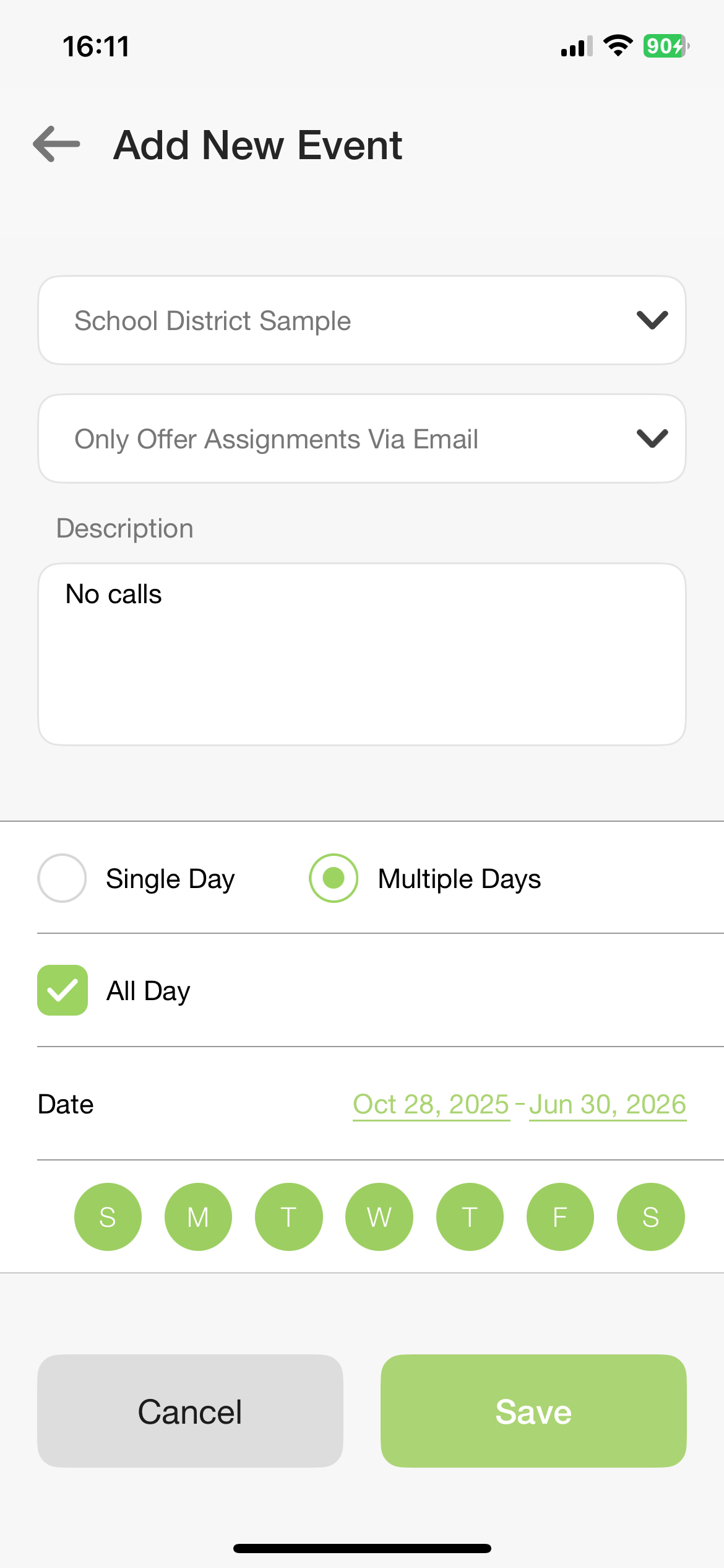 2. Tap on a date that you’ve marked the “Only Offer Assignments Via Email” option for on your calendar. It will be marked with a purple dot.